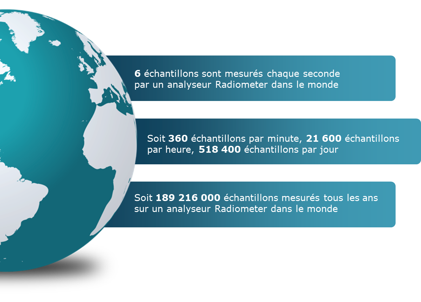 En effet, 5 échantillons sont prélevés chaque seconde par un dispositif d'analyse de Radiometer quelque part dans le monde. Cela représente 300 échantillons par minute, 18 000 échantillons par heure, 432 000 échantillons par jour. Cela représente 157 680 000  échantillons par an, prélevés par un dispositif d'analyse de Radiometer quelque part dans le monde.