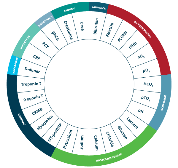 Vue d'ensemble de quelques-uns des paramètres pertinents que vous pouvez mesurer avec la solution de biologie délocalisée Radiometer pour les services d'urgences. Découvrez les paramètres à votre disposition avec nos solutions d'analyse délocalisée pour les services de réanimation, soins intensifs et réanimation néonatale.