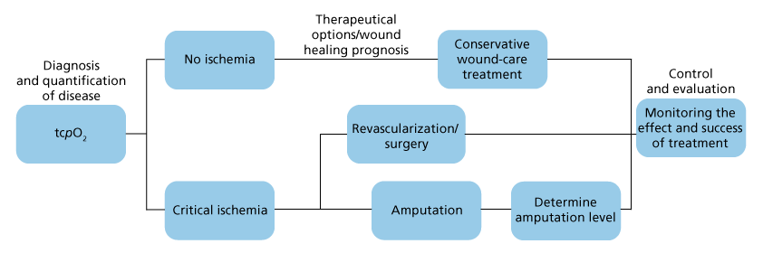 L'arbre décisionnel vous donne un aperçu de la procédure de soins des plaies sur les membres inférieurs. La tcpO2 peut être utile pour examiner la circulation, surveiller le traitement et enfin, évaluer le traitement.